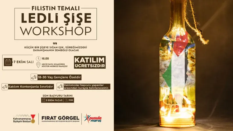 Kahramanmaraş Büyükşehir Belediyesi, gençlere yönelik anlamlı faaliyetlerini Pusula Maraş çatısı altında sürdürürken, Filistin'de yaşanan zulme dikkat çekmek ve farkındalık oluşturmak amacıyla özel bir etkinliği daha hayata geçiriyor. Gençlik Hizmetleri Şube Müdürlüğü koordinesinde 7 Ekim Salı günü Necip Fazıl Kısakürek Kültür Merkezi bahçesinde düzenlenecek atölyede, "Filistin Temalı Ledli Şişe" çalışması gerçekleştirilecek. 18 – 30 yaş aralığındaki gençlerin katılım sağlayabileceği etkinlikte, küçük bir şişeye yerleştirilecek ışıkla hem dayanışmanın sembolü olunacak hem de Filistin halkına destek mesajı verilecek. Etkinliğe katılmak isteyen gençler, https://kahramanmaras.bel.tr/duyuru/2025/10/01/filistin-temali-ledli-sise-workshop-basvuru-formu internet adresindeki başvuru formunu doldurarak kayıt yaptırabilecek. Son başvuru tarihi 5 Ekim Pazar.